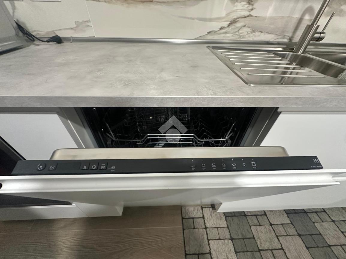 La cucina è completa di elettrodomestici, tra cui lavatrice, asciugatrice, lavastoviglie e forno, per garantire il massimo comfort.