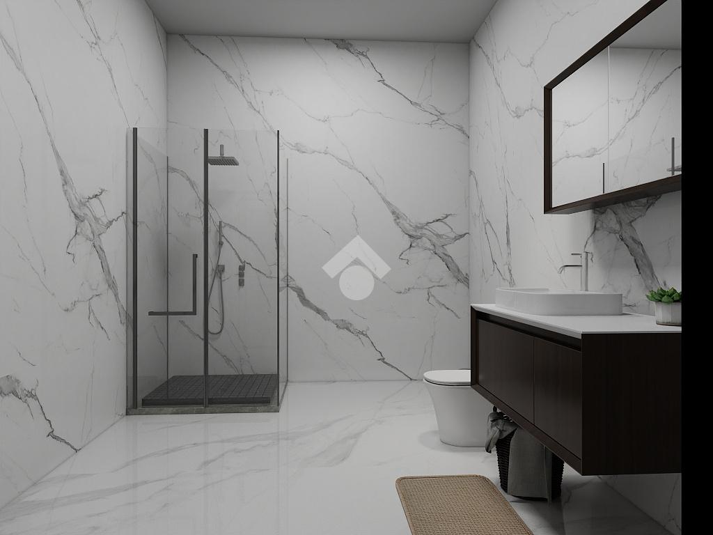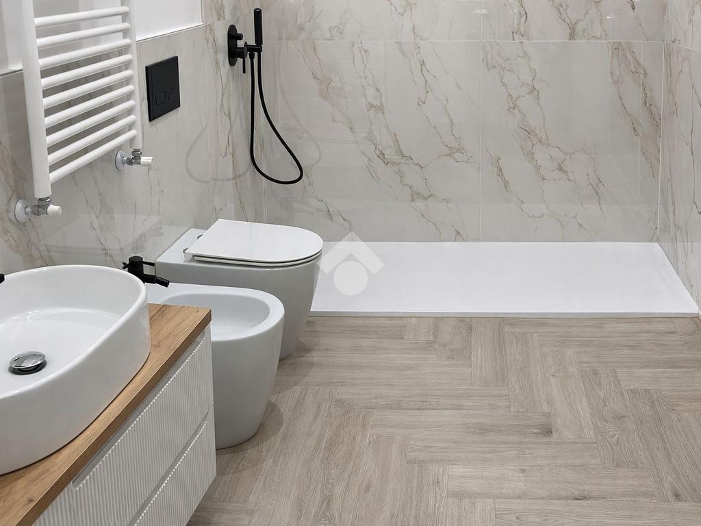 • Nei bagni pavimentazione in gres effetto marmo chiaro formato 60x120.